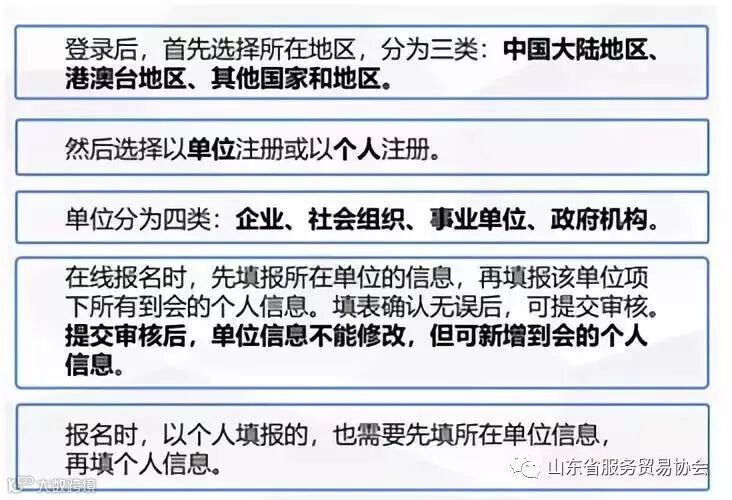 博览会接受专业观众(包括采购商、政府机关、事业单位、社会组织等方面的业内人士)在线报名,不接受现场报名,请登陆博览官网(https://www.ciie.org/ciie/f/visitor/pre-book)进行报名注册。报名注册流程:获取邀请码—登录网址—填报基本信息—选择所在地区—输入统一社会信息用代码、交易团邀请码—手机验证—单位信息登记—人员信息登记—提交审核。