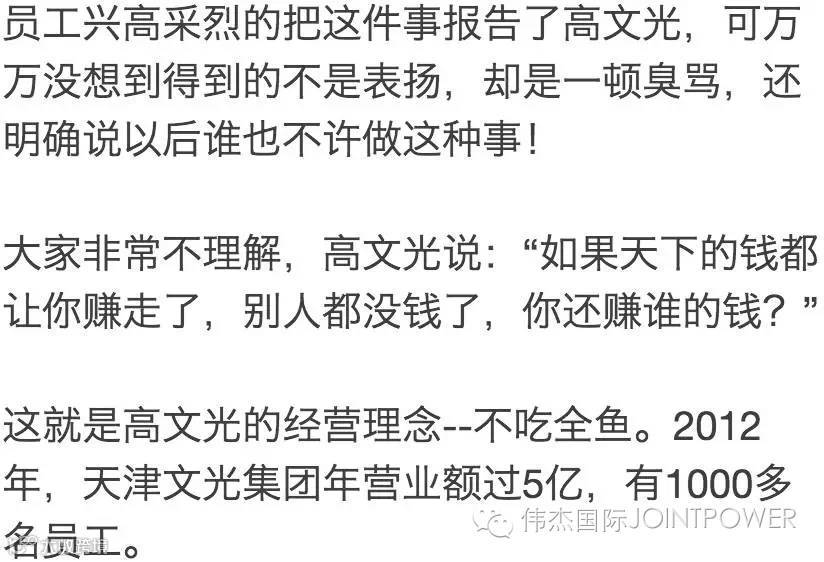 公司的客户基本都是批发商,慢慢被养懒了,当员工送货上门时,还要帮他们把货摆上货架,甚至直接让员工把货送给用户,也就是说,这些批发商根本不用做什么,直接赚取差价。公司的员工对此很有意见,但高文光却说:“客户越懒,咱们越有饭吃。”