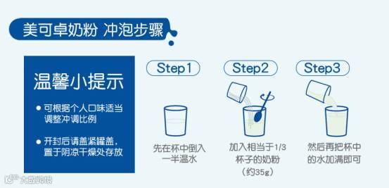 步骤2:加入1 / 3杯的美可卓全脂速溶奶粉,轻轻地搅拌至溶解
