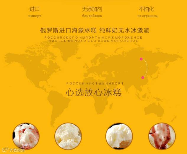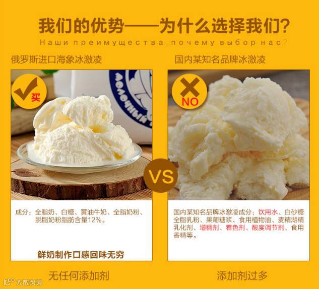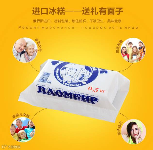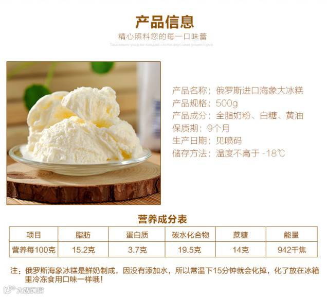 纯正俄罗斯海象冰糕冰糕,纯奶油制作,不含任何添加剂。 “童年的味道,童年的回味。吃了才知道,好吃不后悔 ”。无论是冷冻,还是解冻再冰冻味道不变,水油不分离,想怎么吃就怎么吃,好吃到你根本停不下来。
