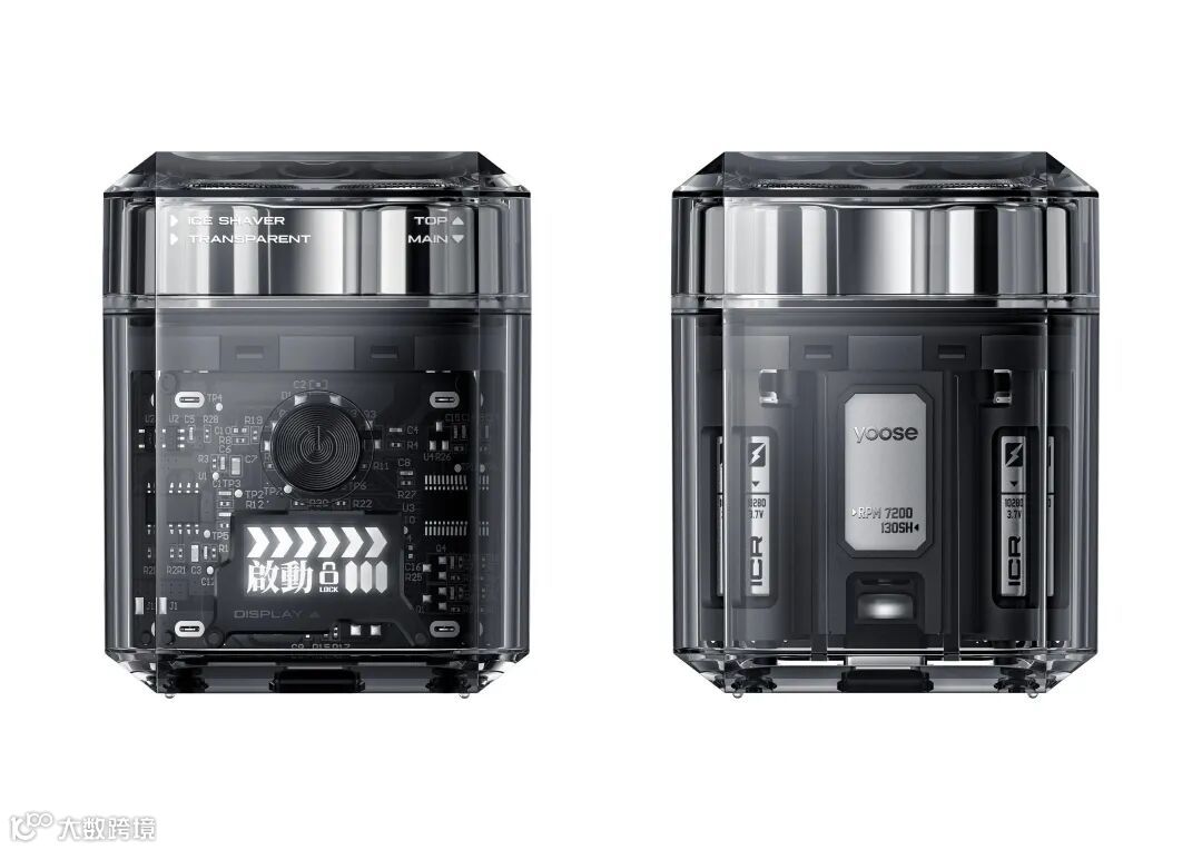 市面上首款透明便携剃须刀,首款全可视化透明设计,通过透明材料的光学性质,钻石切面形成独特的透光性和折射表现,使产品晶莹剔透,构建出多层次的工业美学,以赛博朋克风格深度定制的超薄数码屏,搭配清晰可以见的PCB电路板与内部元器件,展示出精密的结构设计,高集成度小巧机身,超轻携带,专门针对年轻用户群体打造的潮流单品。