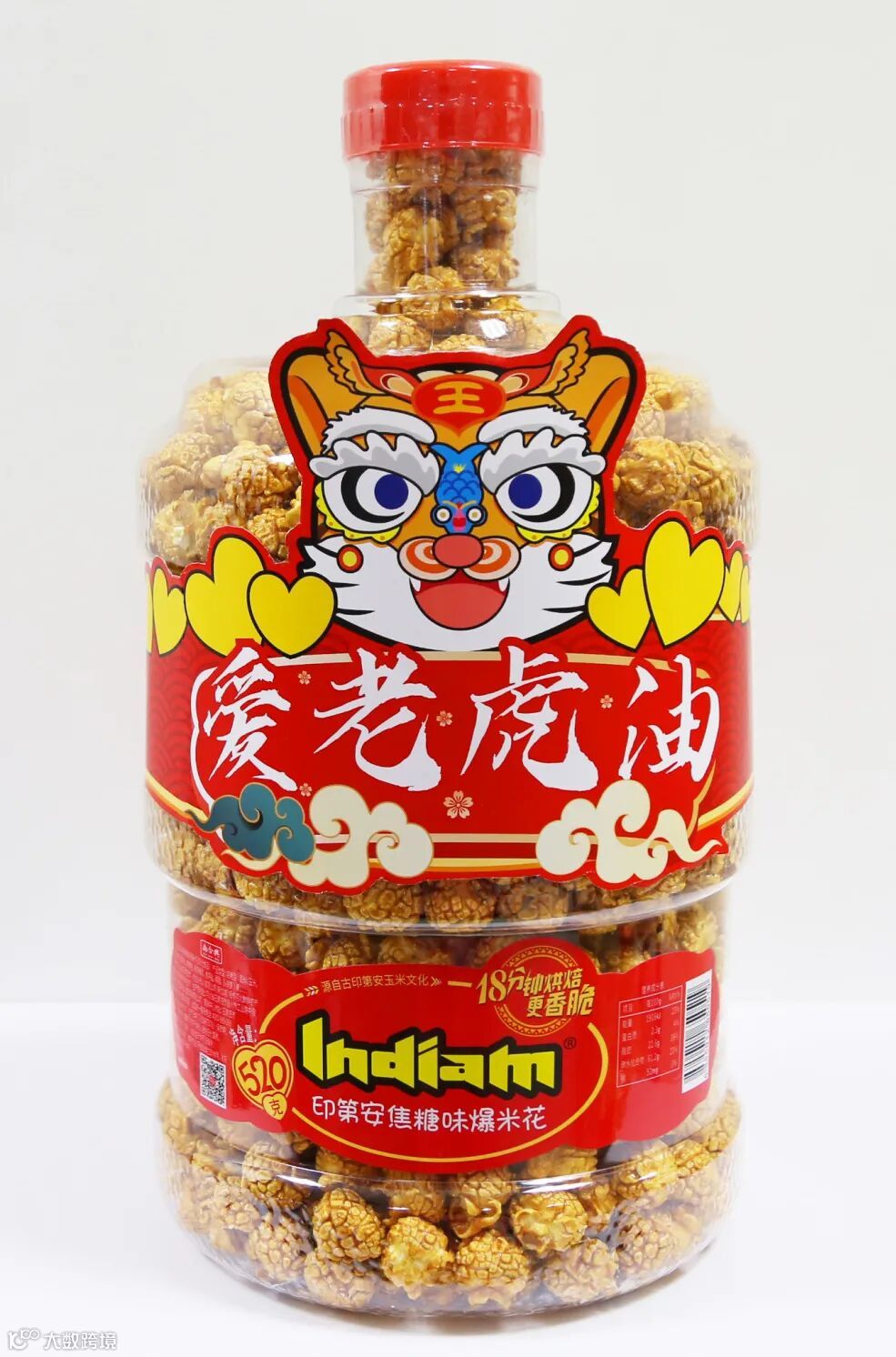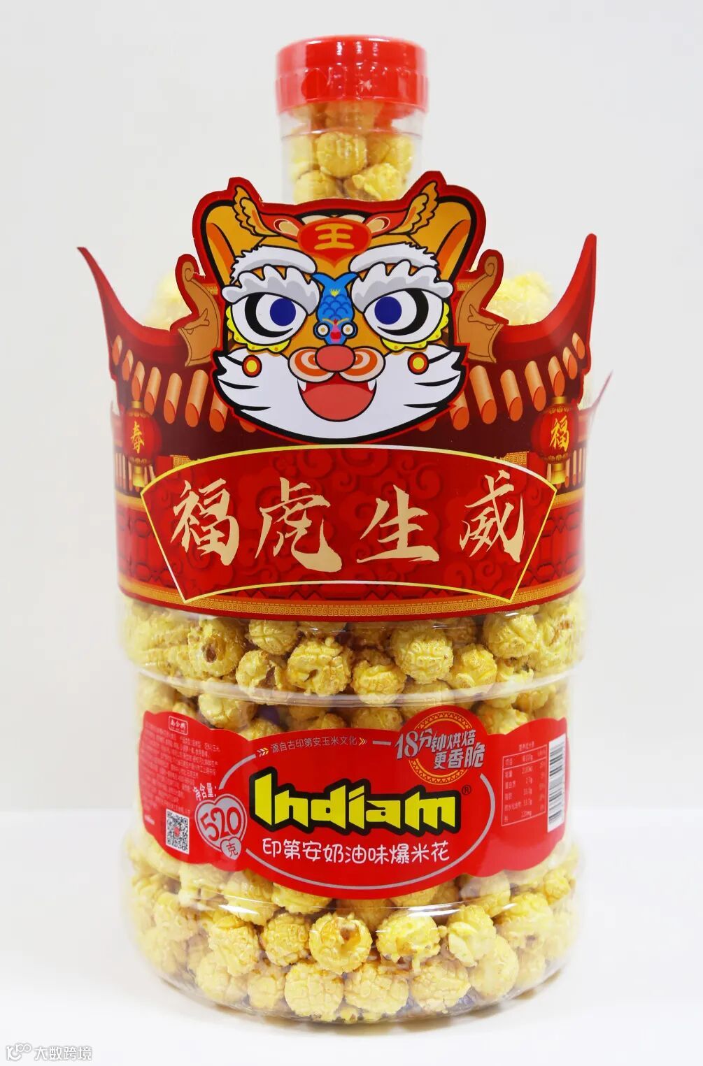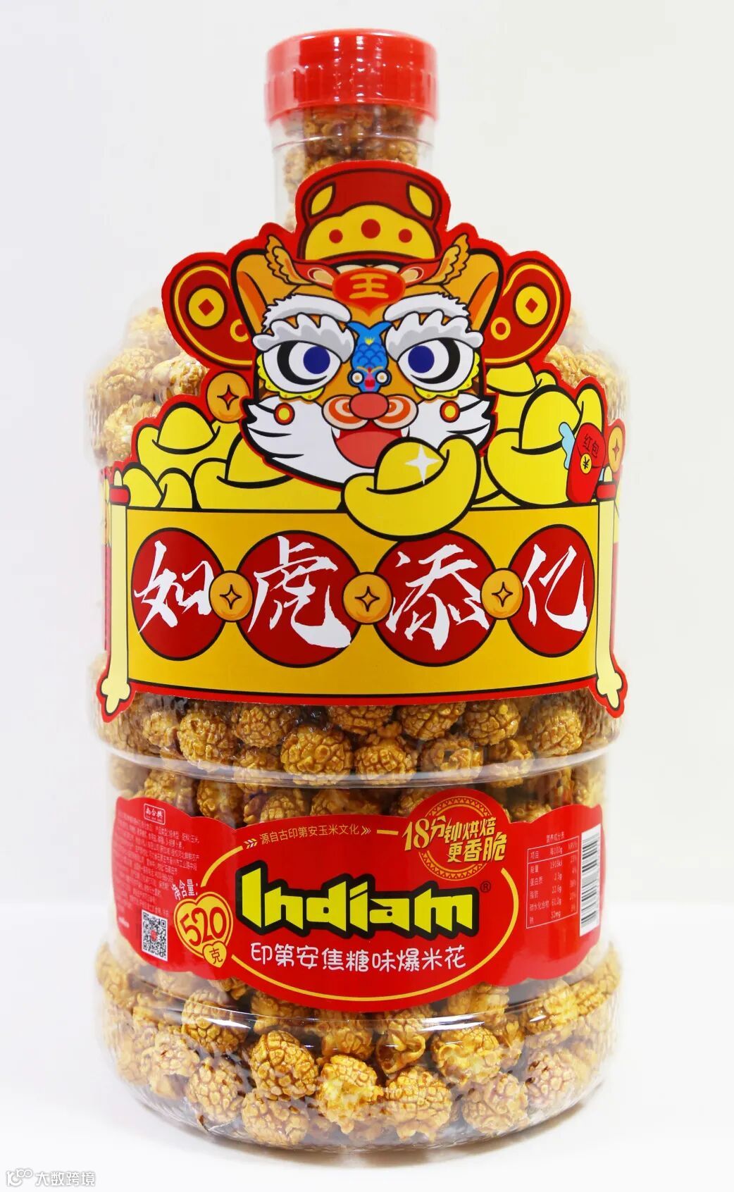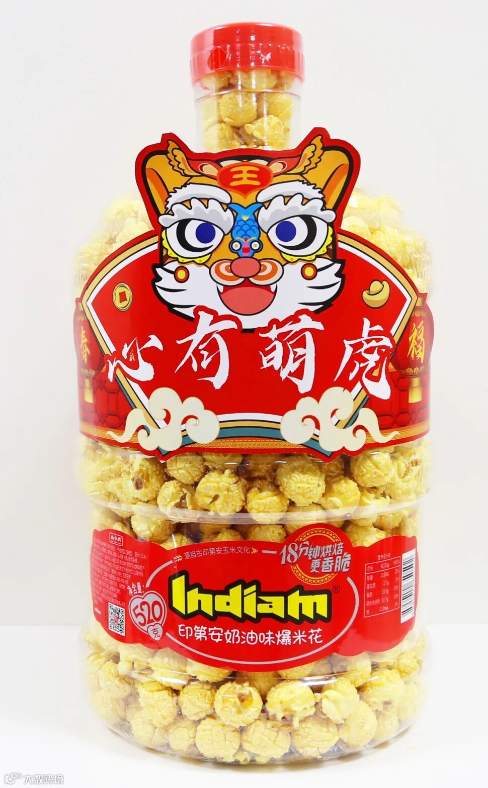 Indiam印第安爆米花520g超大桶虎年限定款焕新上市!标签以虎元素为主题,携带美好祝福“如虎添亿”、“心有萌虎”、“福虎生威”、“爱老虎油”,繁花似锦,明月迎春处,开启虎年好“照”头!