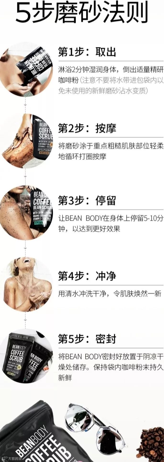 Bean Body使用纯天然原材,选用星巴克同一种植园的天然有机咖啡豆,经过粗细度最佳的精心研磨,将咖啡的四种超级明星因子完美释放。