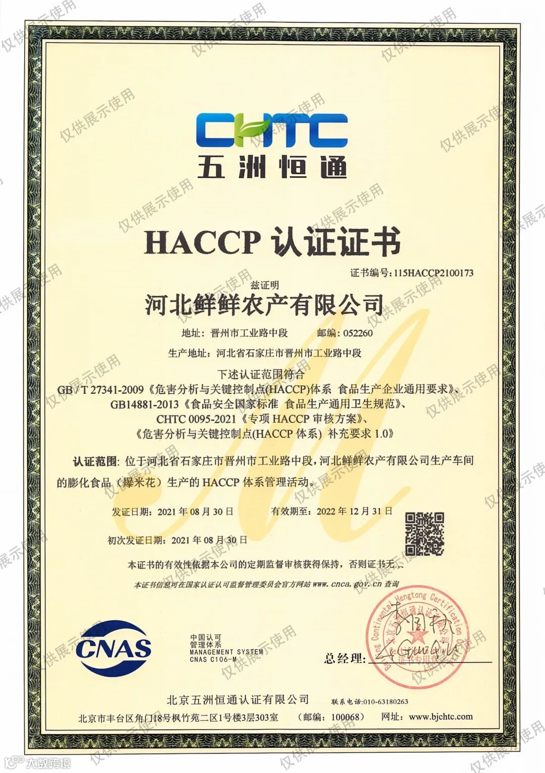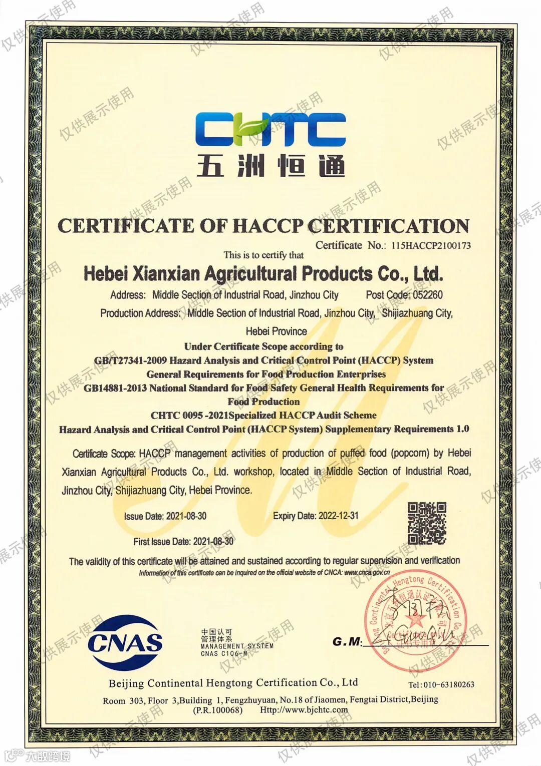 近日,Indiam爆米花再获得HACCP体系认证证书!