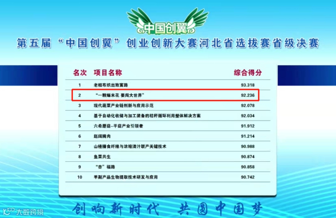 7月3日,为期4天的第五届“中国创翼”创业创新大赛河北选拔赛省级决赛圆满落下帷幕。联达兴盛公司的项目“一颗爆米花,要闯大世界”荣获乡村振兴专项赛第二名!
