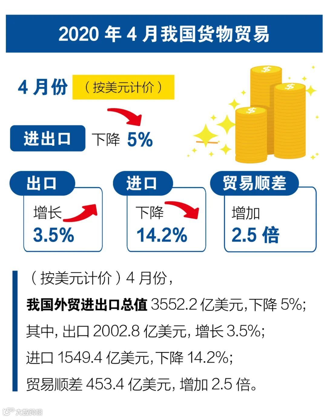 4月份,我国外贸进出口2.5万亿元,同比微降0.7%;其中,出口1.41万亿元,增长8.2%;进口1.09万亿元,下降10.2%;贸易顺差3181.5亿元,增加2.6倍。