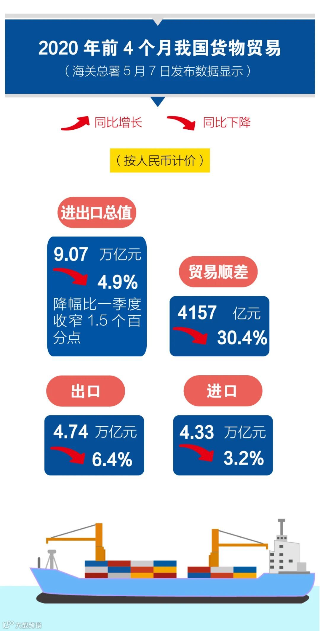 据海关统计,今年前4个月,我国货物贸易进出口总值9.07万亿元人民币,比去年同期(下同)下降4.9%,降幅比一季度收窄1.5个百分点。其中,出口4.74万亿元,下降6.4%;进口4.33万亿元,下降3.2%;贸易顺差4157亿元,减少30.4%。