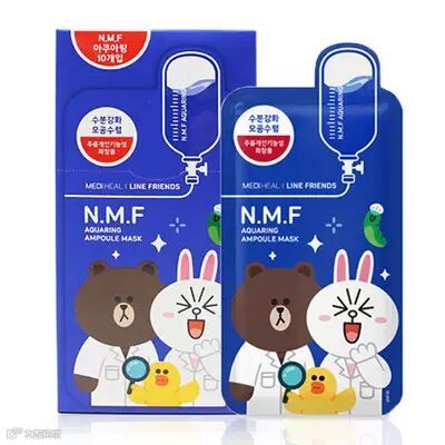 使用感受:纯棉长纤维材质,非常可爱的卡通印在面膜上。布朗熊、可妮兔蓝色:NMF 补水 超强补水保湿。含有保湿因子跟透明质酸成分。补水保湿的同时有效的缩小毛孔。非常服帖。清爽不黏腻。使用效果非常好,第二天,皮肤水嫩看的见。