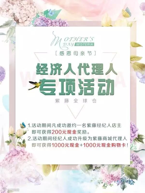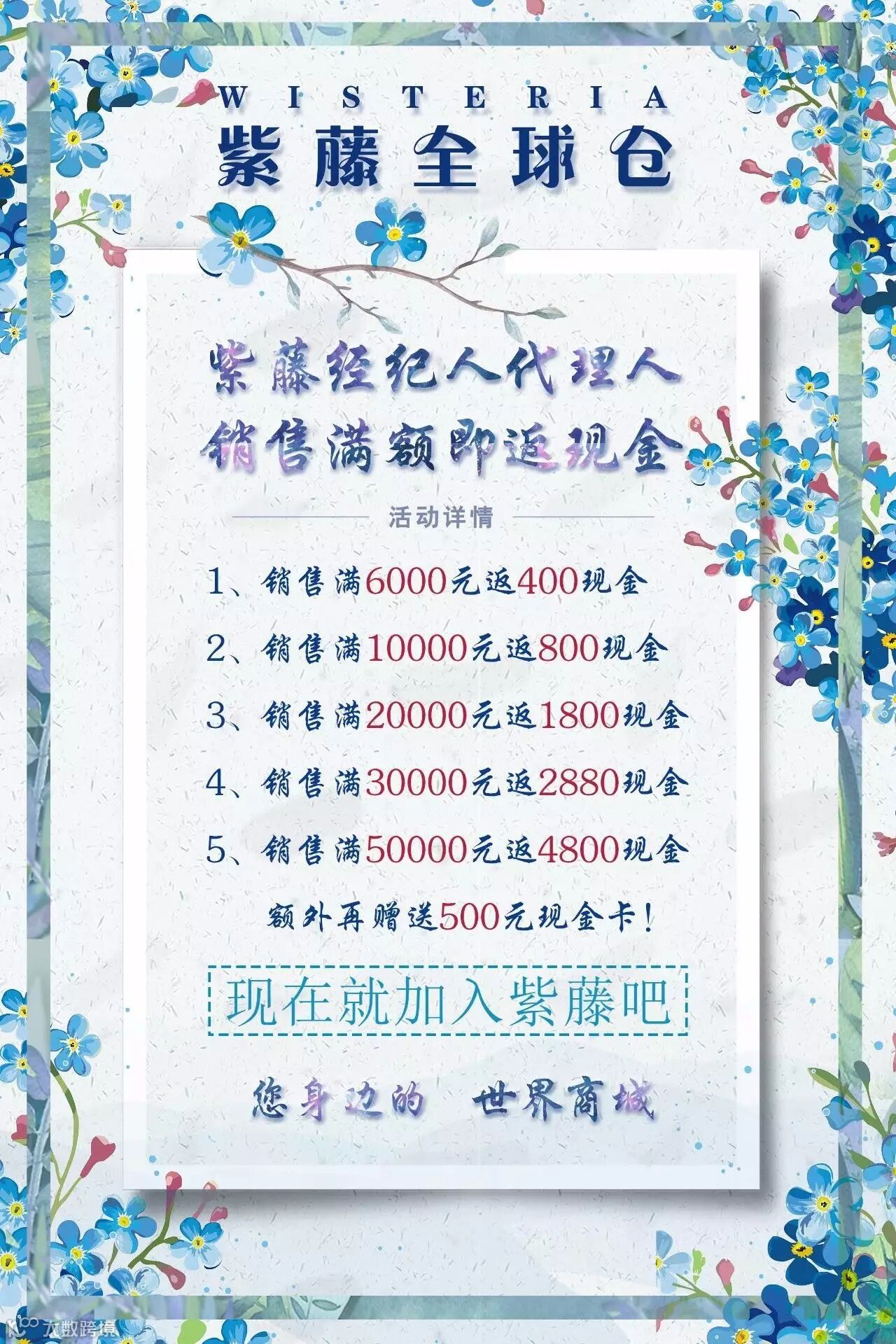② : 活动期间经纪人成功升级为紫藤全球仓商城代理人,即可获得1000元现金+1000元现金购物卡