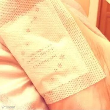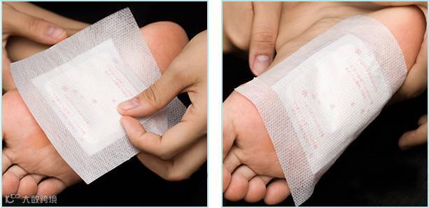 然后将粘了药包的贴纸贴在脚底。粘贴的很紧,也不用担心会沾染床单~