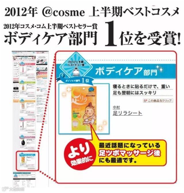 树之惠美人足贴是日本12年年度的cosme身体护理类冠军!日本的美妆、身体护理类产品一向是很多很多的,竞争非常大,所以能拿到日本cosme大赏第一名也是经得起考验的~