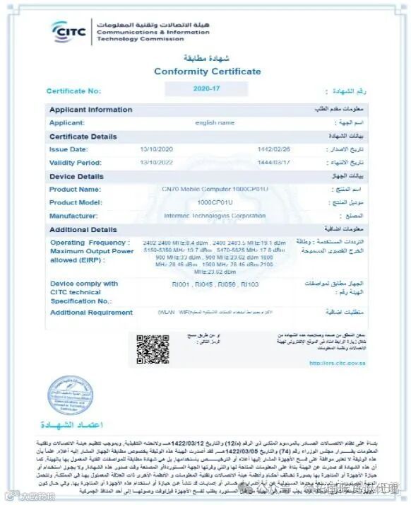 CITC的要求涵盖无线电/无线元件,而不是整个最终产品,并且通常会根据一揽子文件进行评估,包括制造商的符合性声明、无线电、安全和 EMC 的测试实验室测试报告、技术规范、用户手册、照片和完整的申请表。