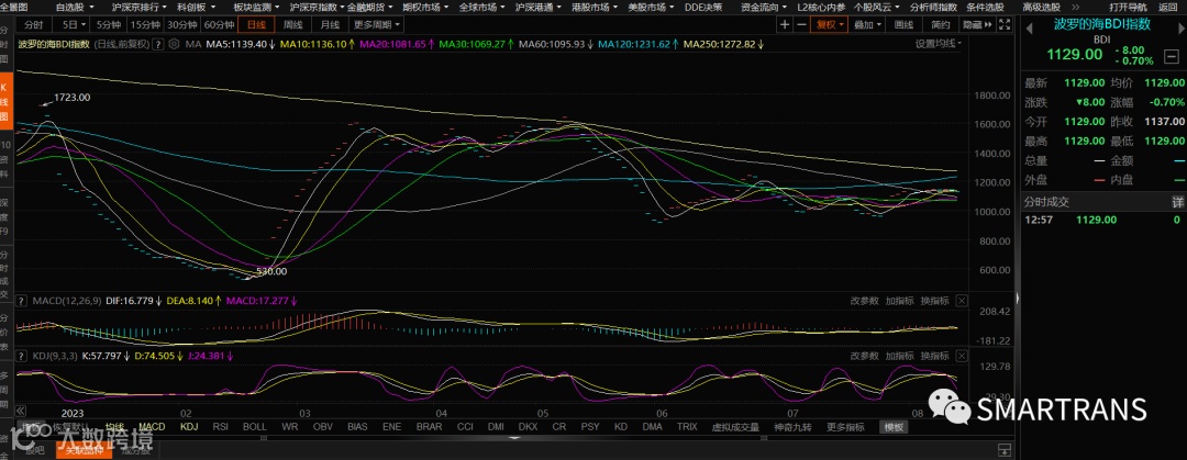 波罗的海指数(BDI)2023年8月11日波罗的海交易所的主要海运指数BDI下跌0.7%,波罗的海干散货运费指数(BDI)报收1129点.