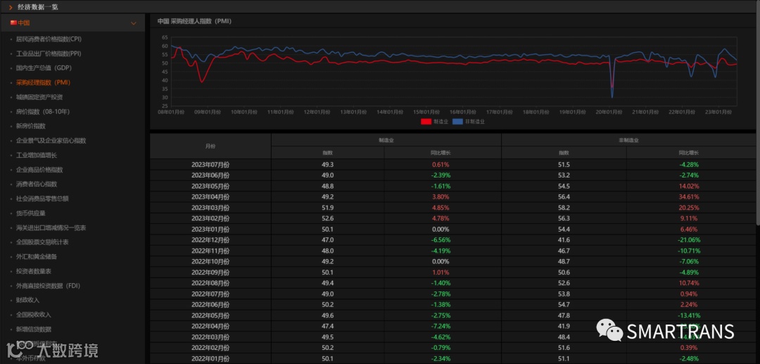 国际采购经理人指数(PMI)制造2023年7月份49.3; 采购经理人指数是以百分比来表示,常以50%作为经济强弱的分界点:当指数高于50%时,则被解释为经济扩张的讯号。当指数低于50%,尤其是非常接近40%时,则有经济萧条的忧虑。一般在40~~50之间时,说明制造业处于衰退; SMARTRANS深圳华庭恩随时为您关注外贸形式动向; 请点击上面蓝字“SMARTRANS”关注,