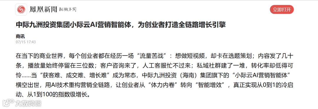 中华网在《中际九洲投资(海南)集团:以AI赋能商业未来,小际云重塑营销生态》一文中,聚焦于小际云AI营销智能体如何通过AI技术赋能商业,构建全新的营销生态。报道指出,小际云不仅解决了创业者在内容创作、客户转化和战略决策中的痛点,还通过大数据分析和智能决策模型,为创业者提供了全方位的支持。