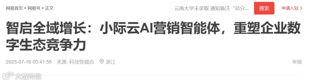 网易以《智启全域增长:小际云AI营销智能体,重塑企业数字生态竞争力》为题,详细介绍了小际云AI营销智能体在全域增长和战略赋能方面的创新实践。报道强调了小际云3.0版本的智能决策功能,通过大数据分析和AI模型,为创业者提供市场洞察、客户画像和精准营销方案,帮助企业降低试错成本,提升决策效率。