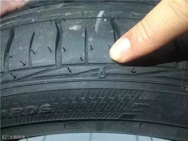 第一条磨损标记,位于轮胎侧面,是一个小小的▲形状。一旦轮胎的磨损触碰到了三角形的尖角,那么这条轮胎就到了必须要更换的地步。