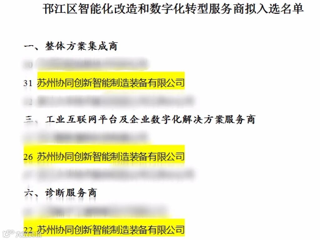 近日,扬州市工业和信息化局及扬州市邗江区工业和信息化局分别发布了“扬州市智能化改造和数字化转型首批服务产品供应商评审结果公示”、“关于邗江区智能化改造和数字化转型服务商评审结果的公示”,苏州协同创新智能制造装备有限公司(以下简称“苏州协同”)凭借工业软件及互联网平台服务类产品供应商、网络建设及系统安全服务类产品供应商两大服务入选扬州市“智改数转”服务商资源池,凭借整体方案集成商、工业互联网平台及企业数字化解决方案服务商、诊断服务商三大服务入选扬州市邗江区智能化改造和数字化转型服务商。