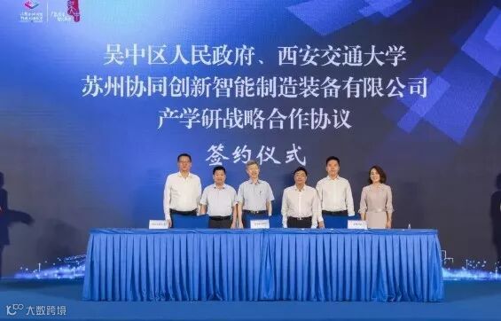 在西安交通大学党委书记张迈曾、中国科学院院士李应红、区委书记唐晓东的共同见证下,吴中区副区长张华谦、西安交通大学科研院常务副院长黄忠德、苏州协同创新智能制造装备有限公司董事长许伟娟完成签约仪式,三方将以“创新驱动、校地联动、优势互补、共促发展”为原则,形成全方位、宽领域、多层次合作关系,共同建成产学研用全链条贯通式高端装备智能制造平台。