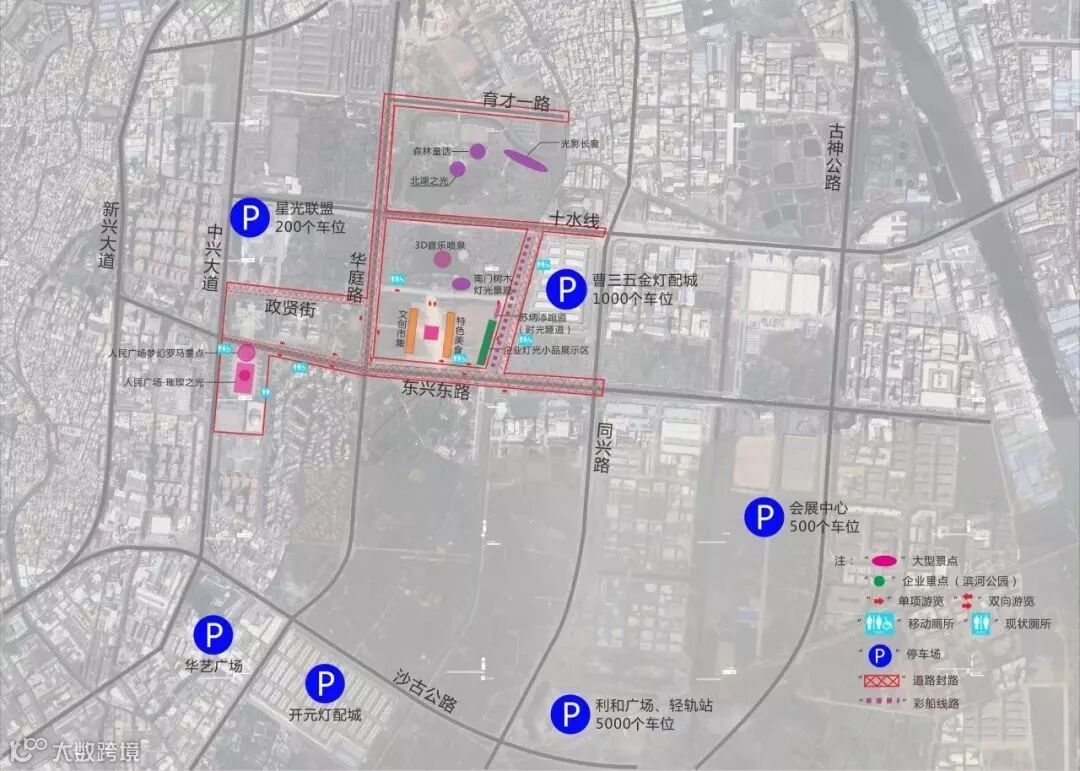 利和广场、城轨古镇站、开元灯配城、华艺广场、光立方、体育馆、星光联盟、瑞丰灯配城、曹三五金灯配城、朗达酒店、会展中心等停车场