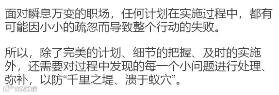 计划只是执行的前提,而行动才是执行的真谛。如果计划不能通过行动去实践与总结,任何完美的计划都只能是一个永不能实现的童话。所以说,工作的关键不是制定多么完美的计划,而是即刻行动!