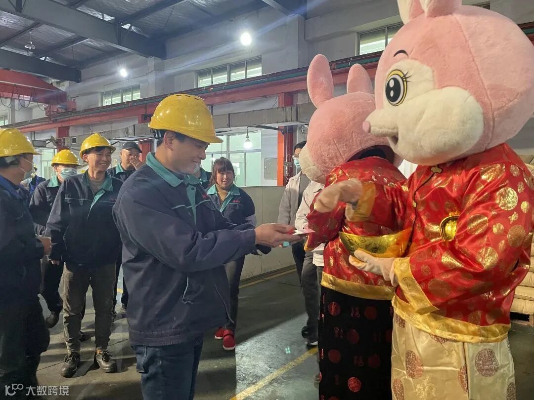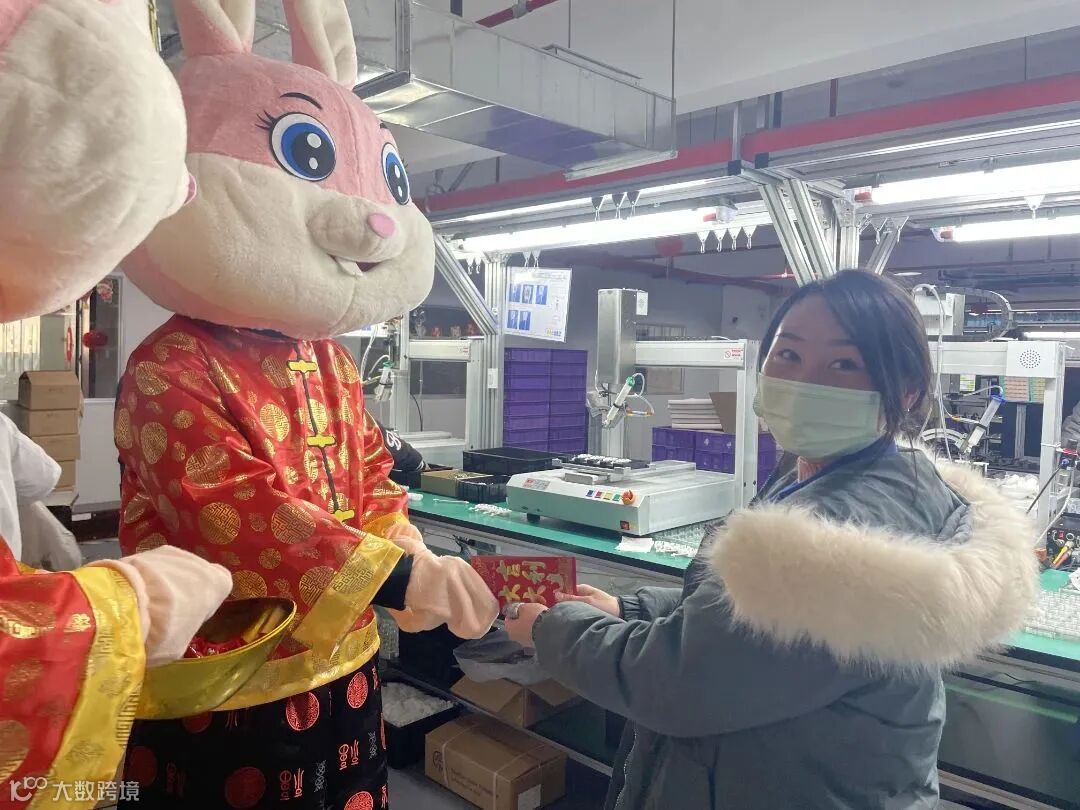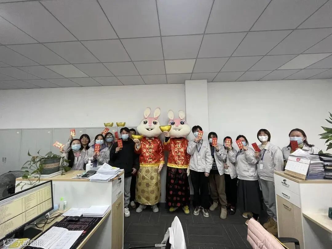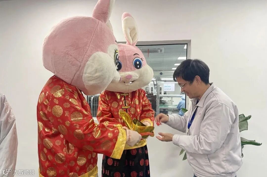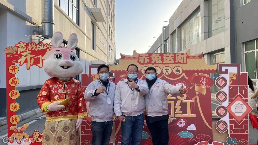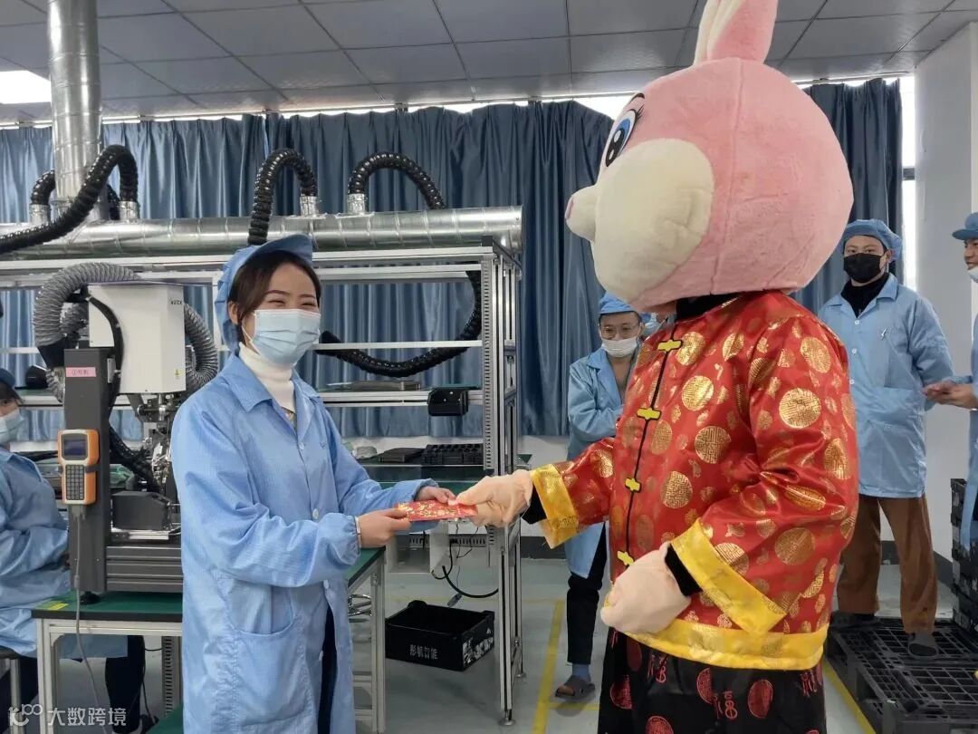 接着,财神兔来到各事业部及产线上,为每名员工送上新春的开门红包,希望大家开工大吉,红红火火,钱程似锦!