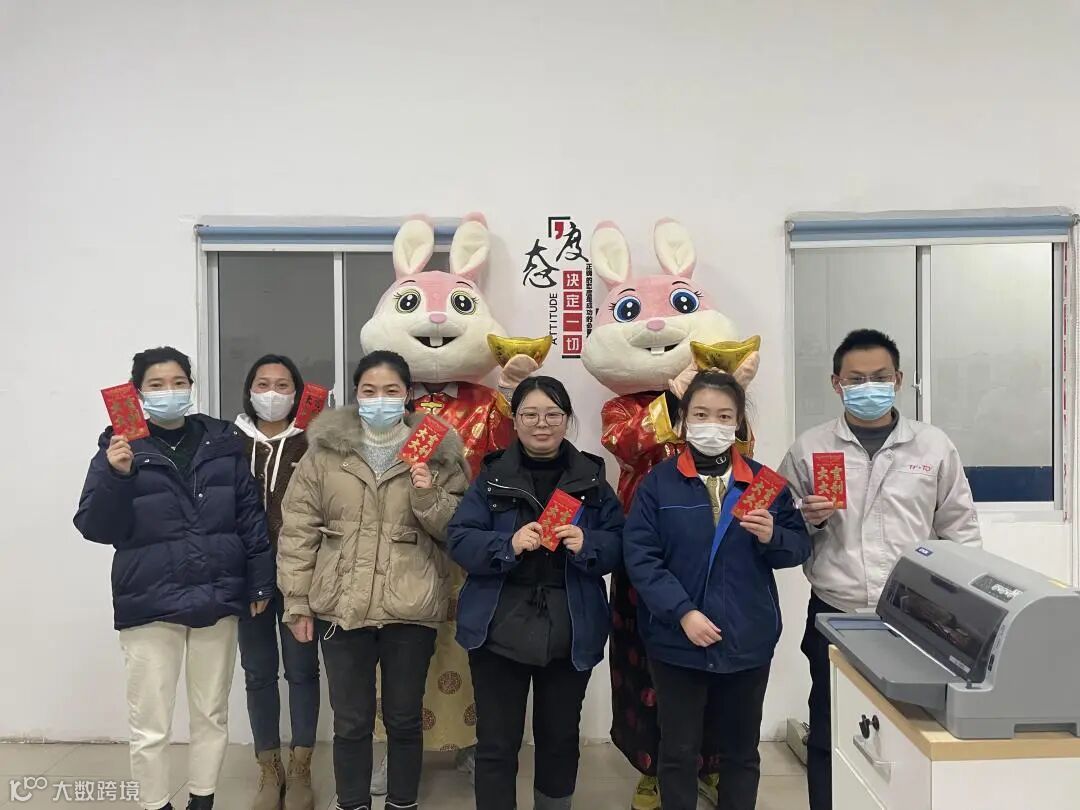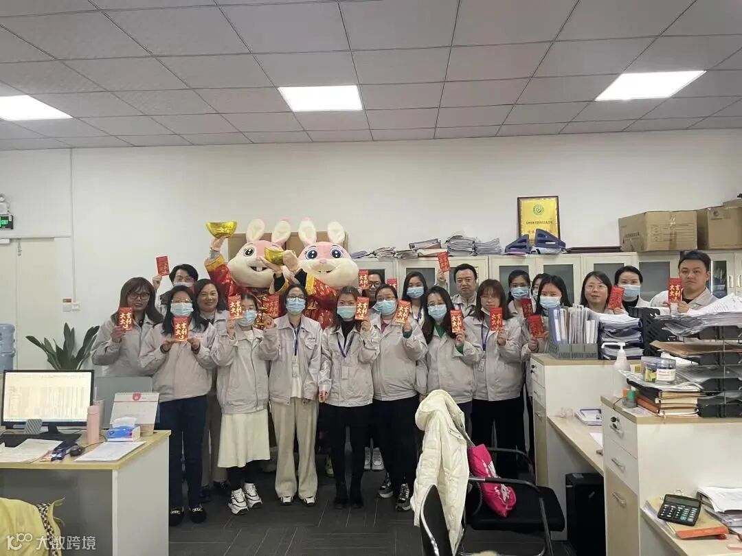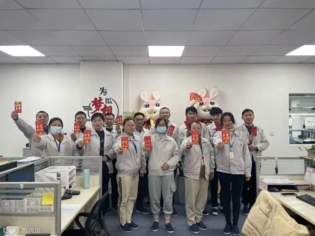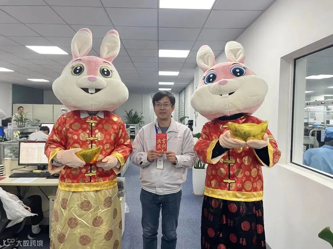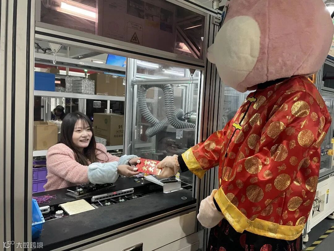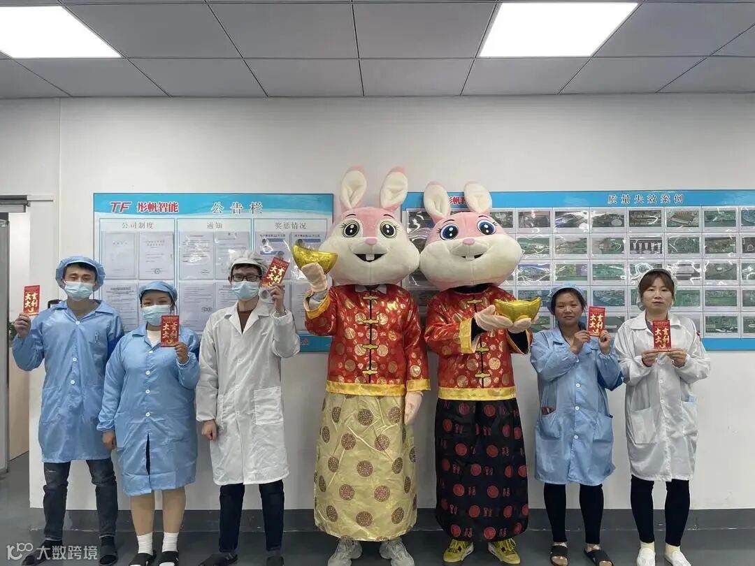 接着,财神兔来到各事业部及产线上,为每名员工送上新春的开门红包,希望大家开工大吉,红红火火,钱程似锦!