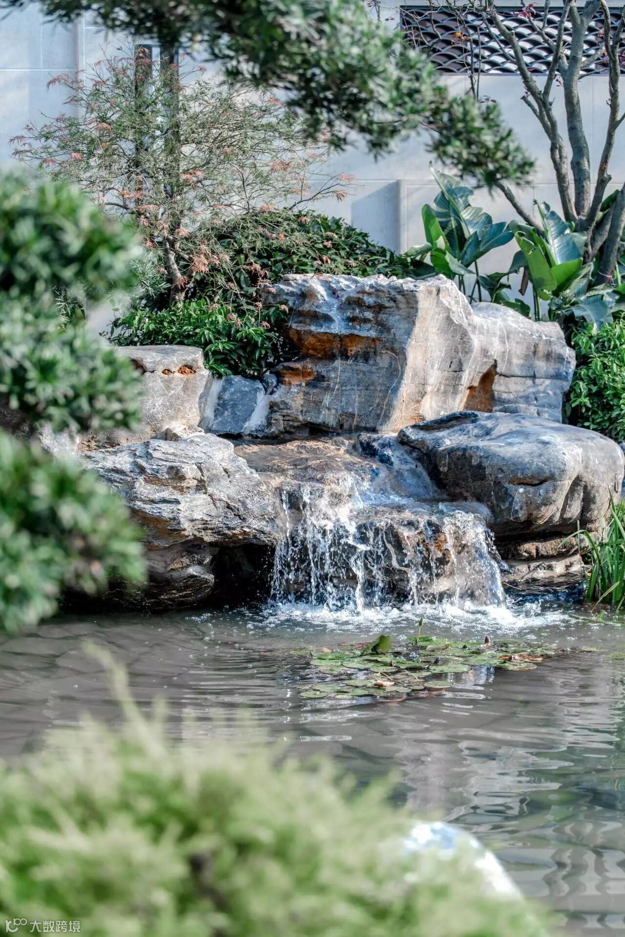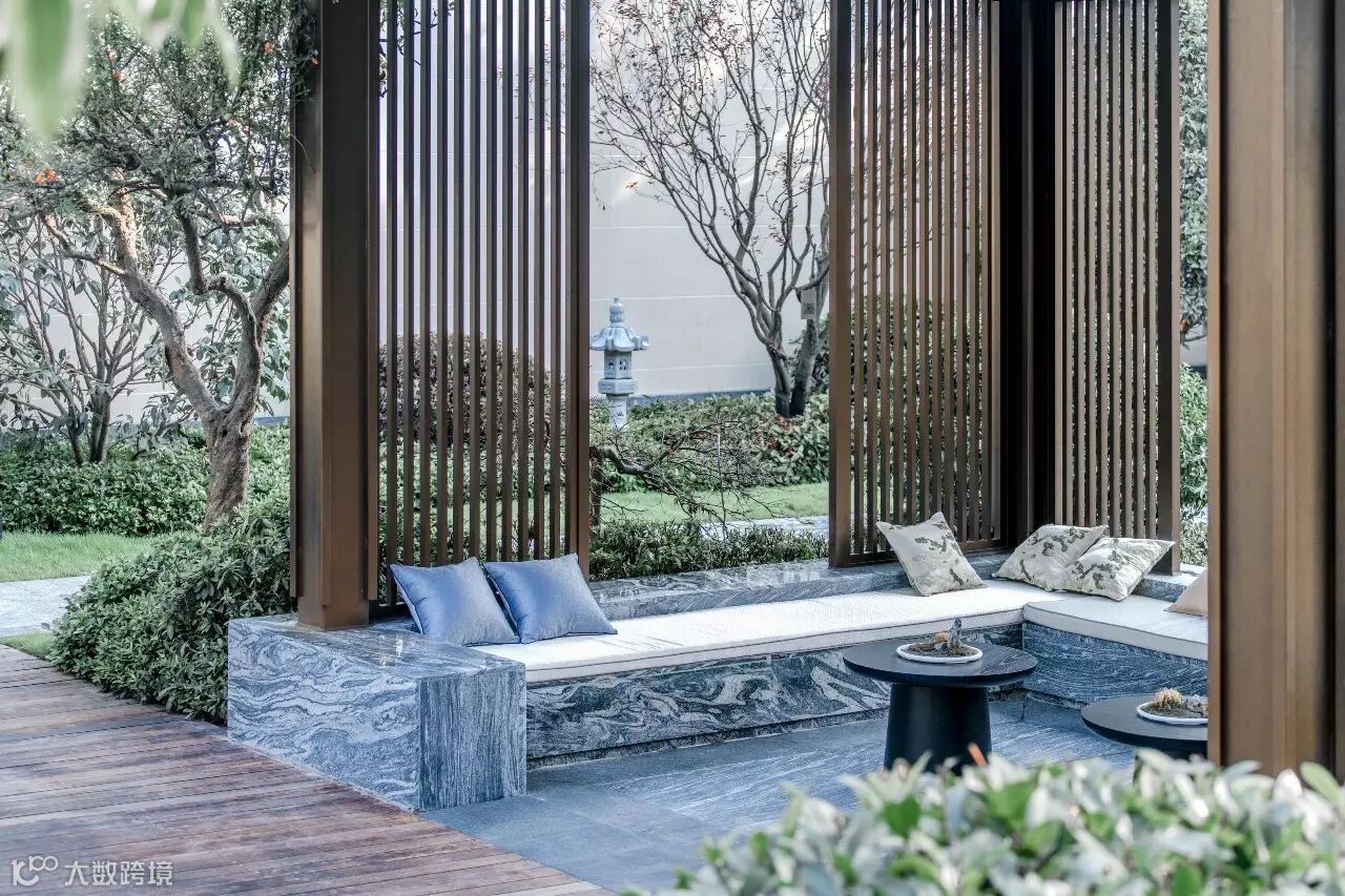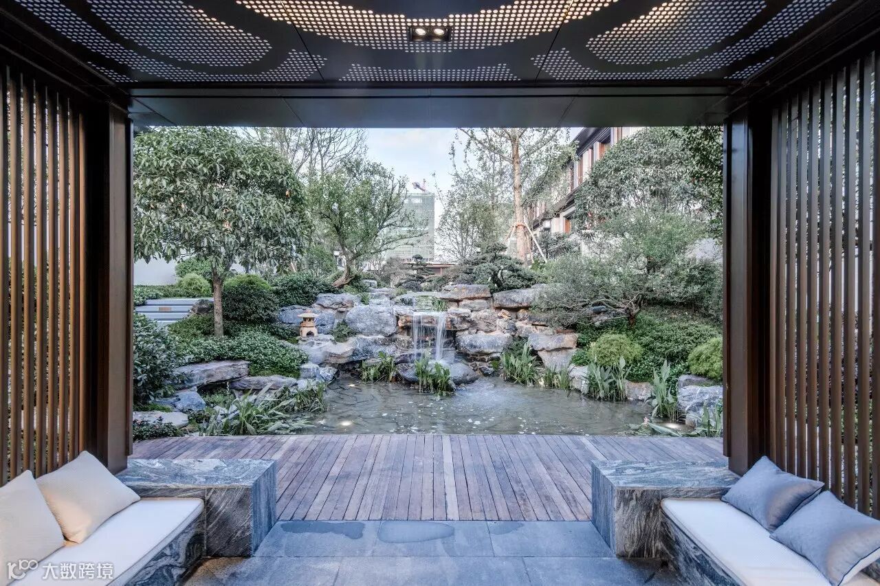 院子以“一池三山”布局,将从日本全冠移植的三棵百年黑松栽植于水面,在巨大的场地尺度上切割出多重场景体验,从而更接近禅的意味。