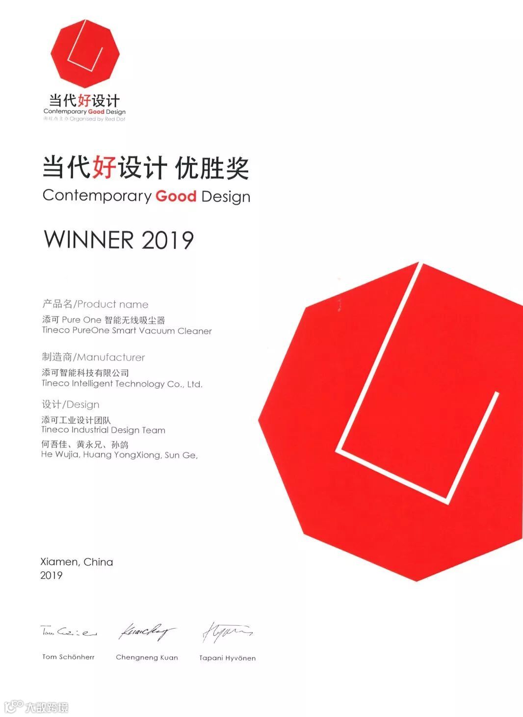 2019“CGD当代好设计”奖报奖范围扩增至49个类目,科沃斯集团旗下添可品牌PURE ONE无线智能手持吸尘器从众多具有创新表现、提供多样品质功能、蕴含丰富内涵情感与环保理念的作品中脱颖而出,一举斩获“CGD当代好设计优胜奖”。