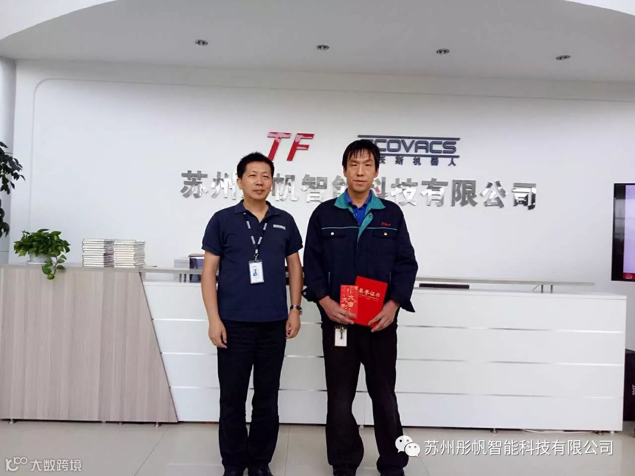 怡润模具厂厂长及电子厂运营总监雷震为第三名得主人事行政部潘留金及品质中心赵文康颁发荣誉证书及现金红包500元.