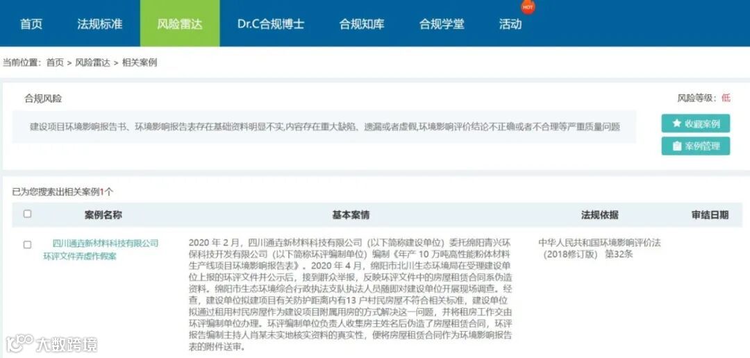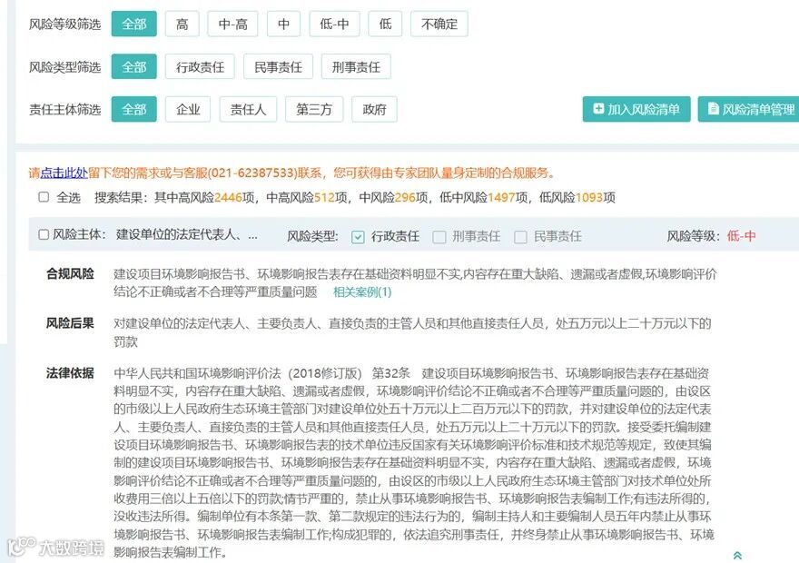 用户可通过关键词、风险等级、风险类型、责任主体查询相应合规风险、合规后果、法规依据。合规风险关联相关案例,方便用户快速浏览案例。