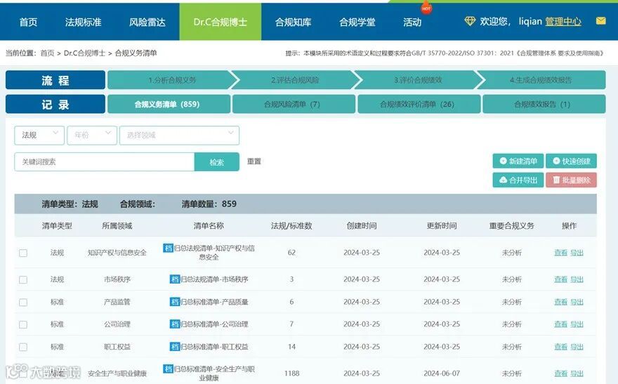 实现法规标准清单的快速建立,帮助用户智能分析合规义务,评估合规风险,实施合规评价,生成合规评价报告。Dr.C合规博士所采用的术语定义和过程要求符合GB/T 35770-2022/ISO 37301:2021《合规管理体系 要求及使用指南》框架要求。