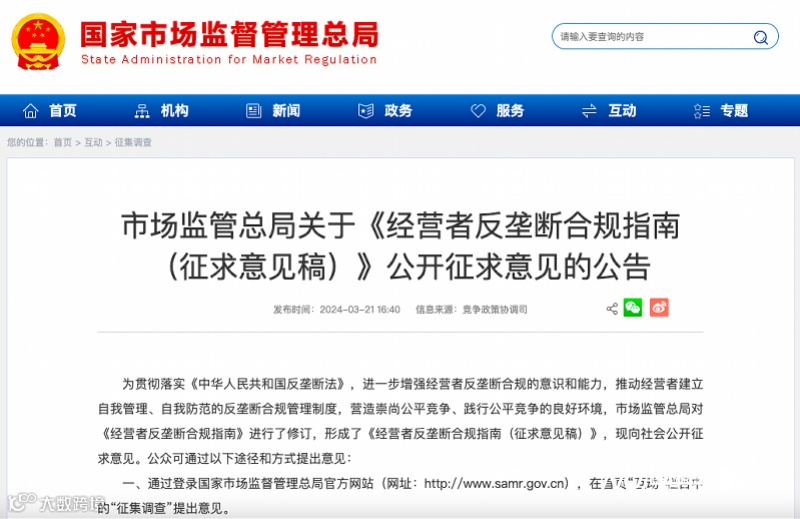 近日,市场监管总局发布《经营者反垄断合规指南(征求意见稿)》,面向社会公开征求意见的截止日期为2024年4月3日。