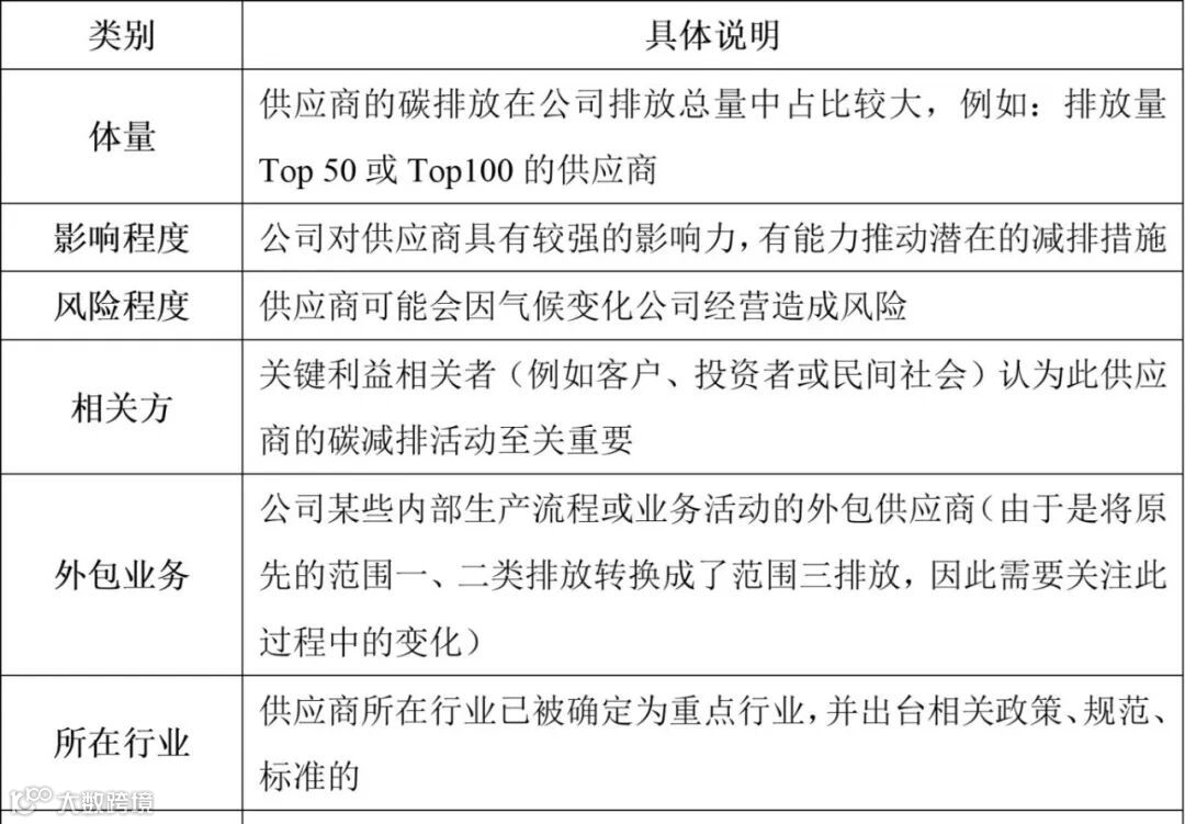 此外,在SBTi的《供应商参与指南》中,也介绍了识别碳管理核心供应商需要考虑的因素,具体可参考下表。