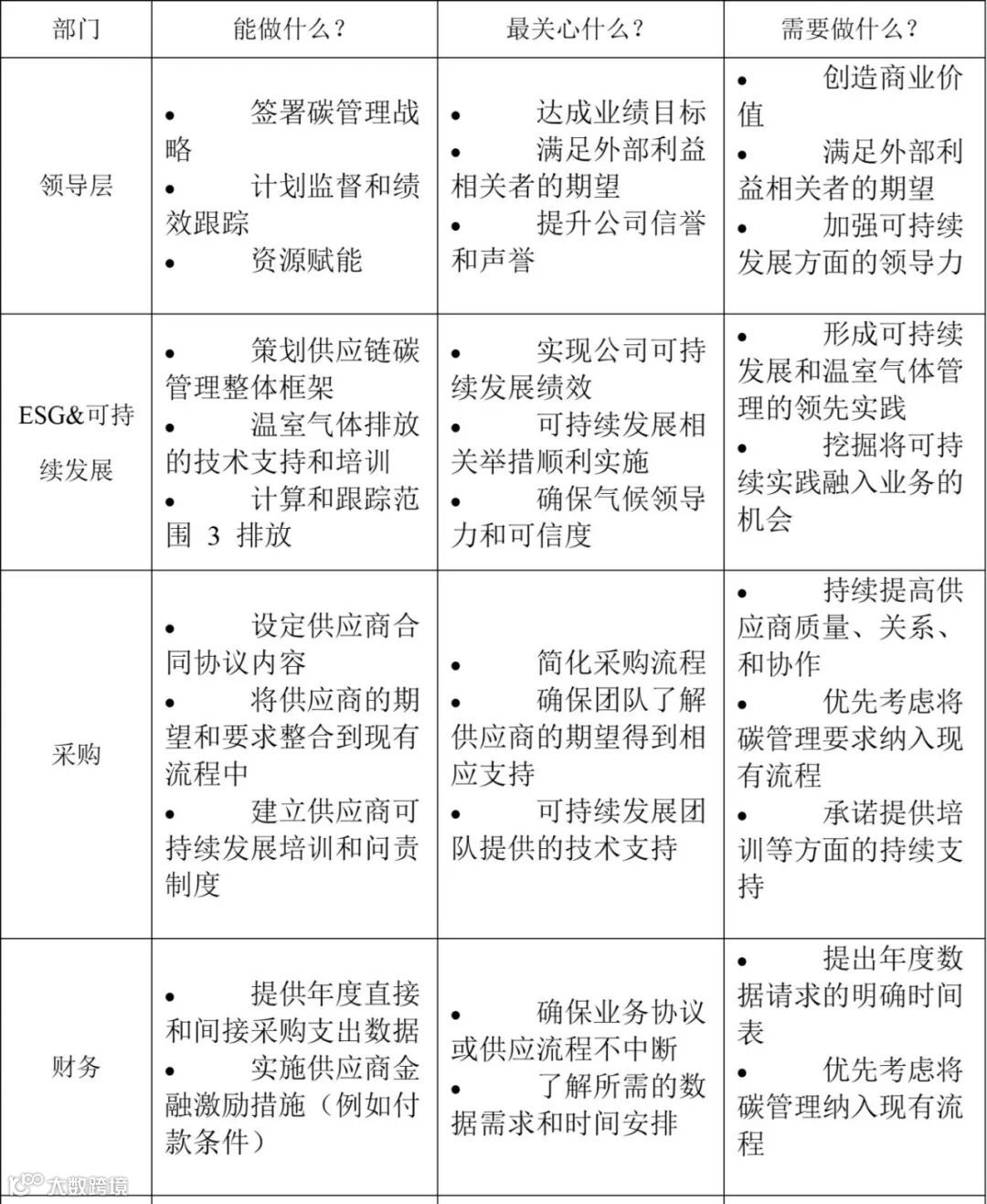 科学碳目标倡议(Science based targets initiative)在2023年6月发布了一份《供应商参与指南》,用于指导企业更好地开展供应链协同碳减排。在这份指南中将“维持内部合力(Secure internal buy-in)”定义为决定供应链碳管理成功与否的关键事项,并给出了内部各方在供应商碳管理中的优先关注事项及其可以起到的作用(详见下表)。
