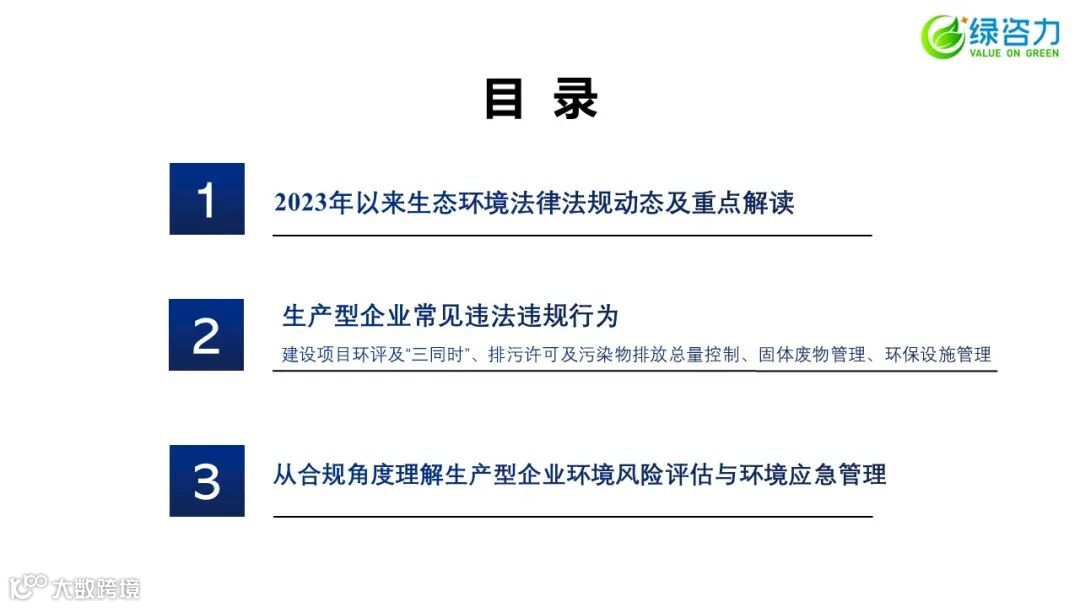 本课题由叶老师主讲,围绕2023年的重点法规变化趋势,包括《生态环境行政处罚办法》、《生态环境领域行政许可事项实施规范》、《重点管控新污染物清单(2023年版)》、《排污许可管理办法》、《碳排放权交易管理暂行条例》、危险废物新国标要点等执法重点解读,辅以分析生产型企业常见违法违规行为案例与企业突发环境应急管理,加强企业人员对法律法规的学习和理解,提升企业对法律法规变化的适应能力和专业应用能力。