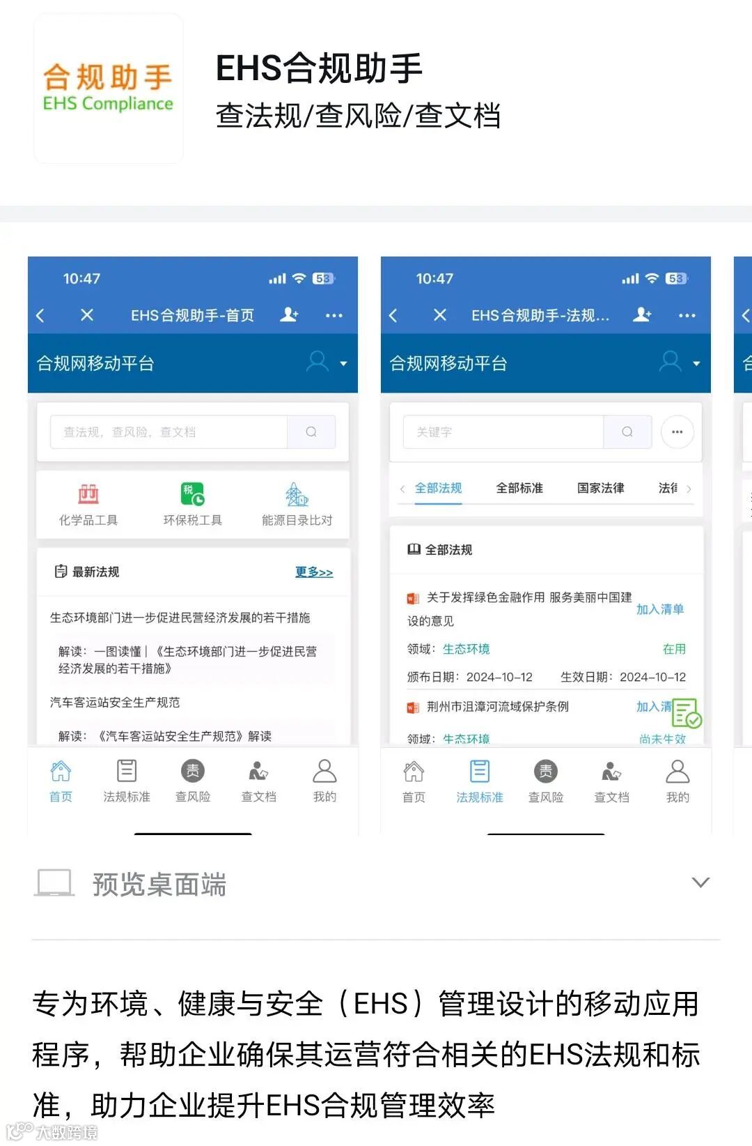 合规网朋友们~非常激动地宣布:我们全新专业移动端工具——“EHS合规助手”已于近日正式上架企业微信第三方应用市场!经过数月的精心策划和开发,我们全新的移动端合规应用将为您提供更加丰富、直观和便捷的在线体验,助力企业提升EHS合规管理效率。