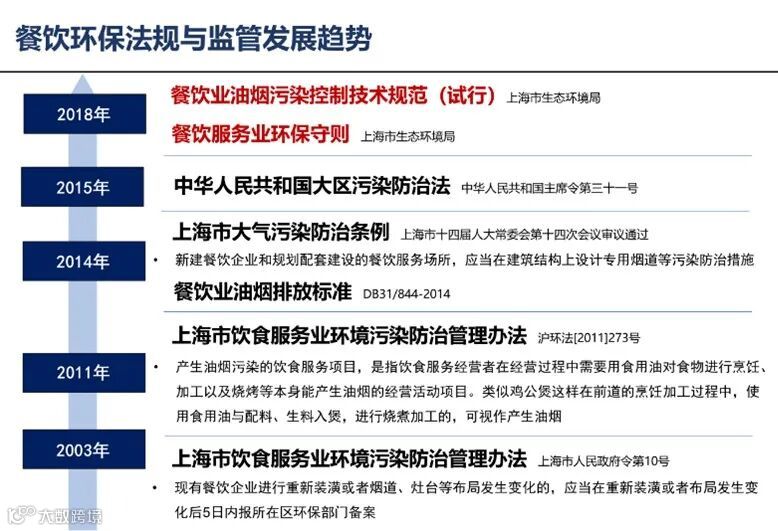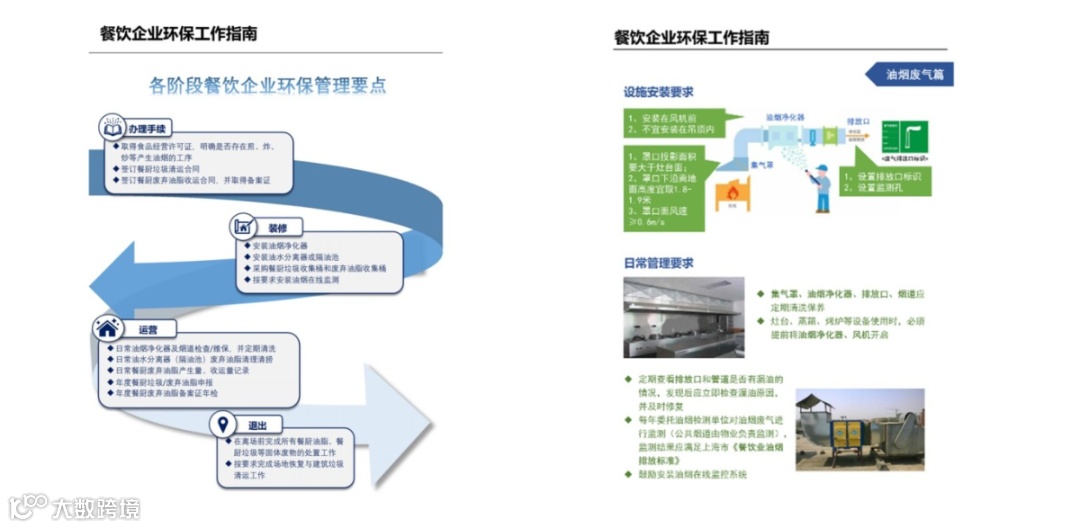 项目伊始,团队在充分收集解读现行餐饮环保法规与监管要求的基础上(见图1),对商场内的大型餐饮企业的摸底调研,找出环保合规漏洞,并从根源上分析潜在的管理断点以及职能缺失。