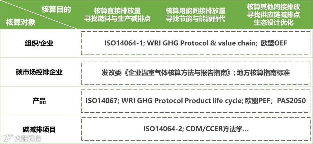 要弄清这个问题,我们需要明确两件事情:碳核算的对象以及碳核算的最终目的,换句话说就是:核算“谁”的碳排放以及核算出来给“谁”看的问题,下面的这张表就帮你快速定位需要参照的核算标准。例如,一家公司需要制定碳达峰碳中和战略规划,那他最好按照ISO14064-1或者欧盟OEF标准进行组织层面的碳核算。与此同时,这家公司的动力电池产品需要进入欧美等国际市场,则需要针对这个产品基于ISO14067或者欧盟PEF规范开展碳足迹的核算。