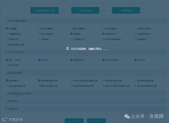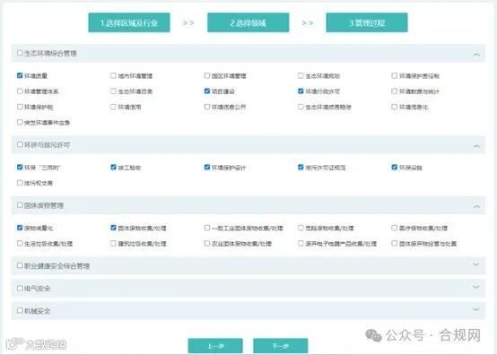 故此,在新版本中我们对这块功能进行了优化,从“区域及行业”、“领域”、“管理过程”等维度,对用户所需清单进行筛选,并以此为基础对我们的法规标准的相关属性标注进行了优化,让用户能够更精准、更快捷地建立起自己所属行业所需的清单,在操作方式上也进行了优化,用户只需要根据系统模块引导,进行选择,一步一步完成清单建立。