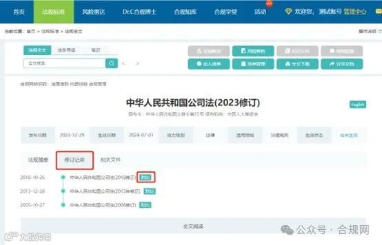 此次改版,除了“快速建立清单”功能的优化调整,我们对新旧法规对比功能也进行了优化,增加了条款差异高亮对比,能更好地展现两个版本的法规条款差异,用户从图2-1点击“对比”进入两个版本的法规对比,进入图2-2。左侧是当前版本的法规条款,右侧为历史对比版本的法规条款。浅红色高亮文字,则为条款内容差异。