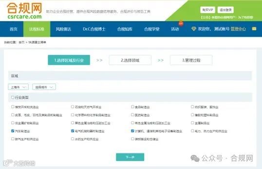 用户可通过此处选择,更好地定位自己所属区域与行业的法规、标准。如下图1-1