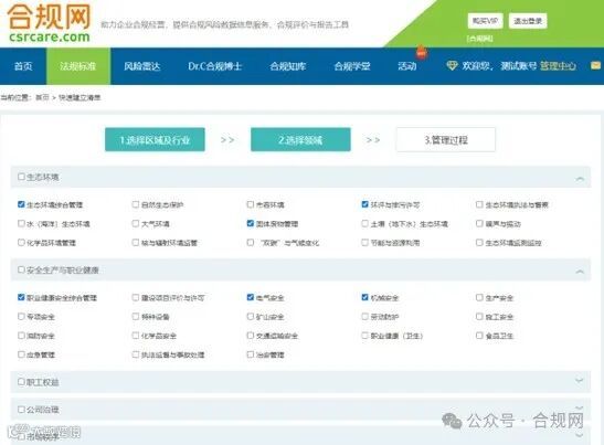 我们此次改版对领域进行了重新划分与优化,用户可通过新的领域分类,进行选择。每个一级领域在后续会生成相应的法规和标准清单。多个一级领域,快速建立的清单会根据领域拆分。具体操作如图1-2
