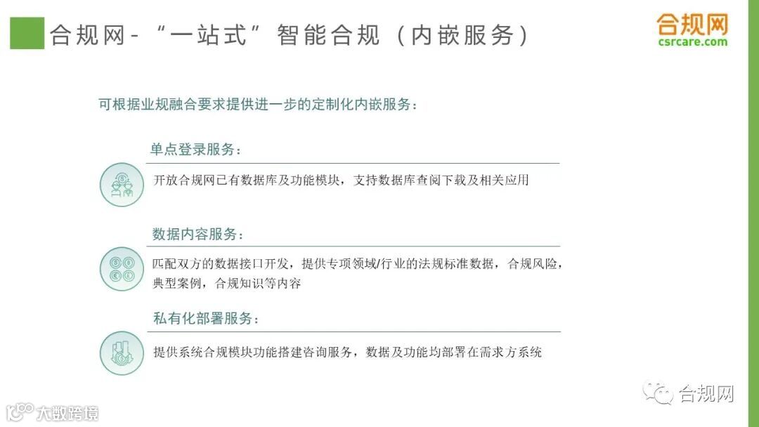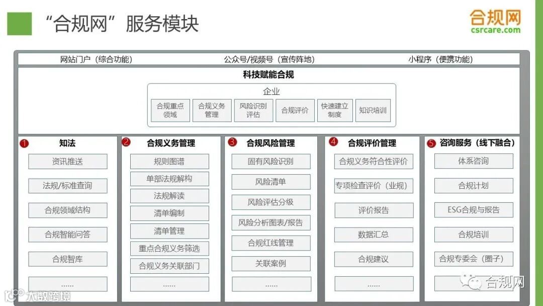 合规网运营始于2010年,是国内最早专注于合规风险管理领域的合规网站,致力于提供O2O合规风控解决方案,至今已服务于上千家企业,包括多家世界500强企业。以A集团为例,其借助合规网自主研发的网站平台和系统有机融合,再结合企业实际情况,内嵌合规平台,节省企业自主开发系统所需的时间和技术成本,平台将合规数据及资料存储在内部服务器中,安全性高,实现数据互联互通以及实时动态监控,同时支持平台功能延展及二次研发。