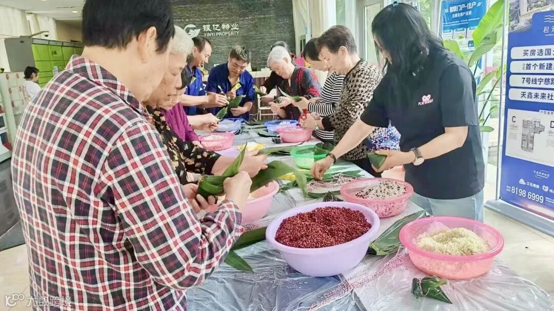 一把糯米,一缕清香,一份情谊,一片思念。端午粽子,不仅是美味,更是情感的寄托。项目活动现场,银亿物业工作人员早已准备好了糯米、红豆、腊肉、精挑细选的咸蛋黄以及新鲜的竹叶等丰富食材。大家围在一起,捋粽叶、做造型、填糯米、封口、扎捆,一个个三角形、枕头形的粽子灵巧地呈现在眼前。