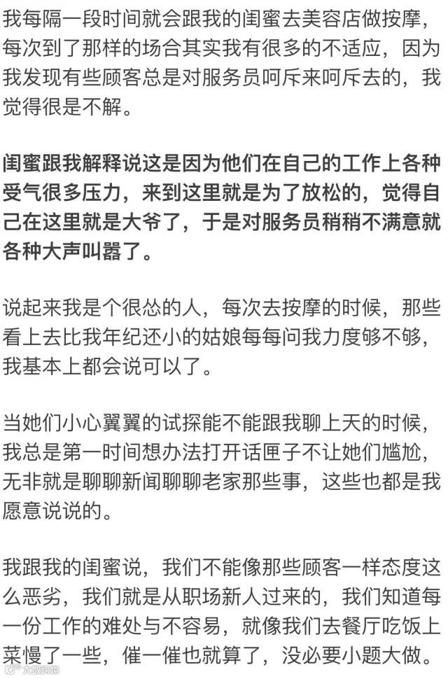 有一次一个按摩的姑娘告诉我,说下个月就要回老家不做了,我于是问她为什么,她说自己弟弟去年刚考上大学需要帮交学费,自己没什么学历只能出来做这一份工作,现在老家的经济好一点了,所以就不想在这里上夜班这么辛苦了。