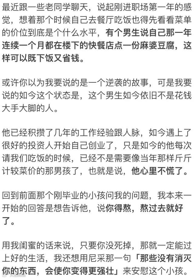 同样的道理,这些过来人,以及或许我有一丁点资格作为另外一波人的过来人身份,我所能告诉你们的就是,没有一种工作是不委屈的。