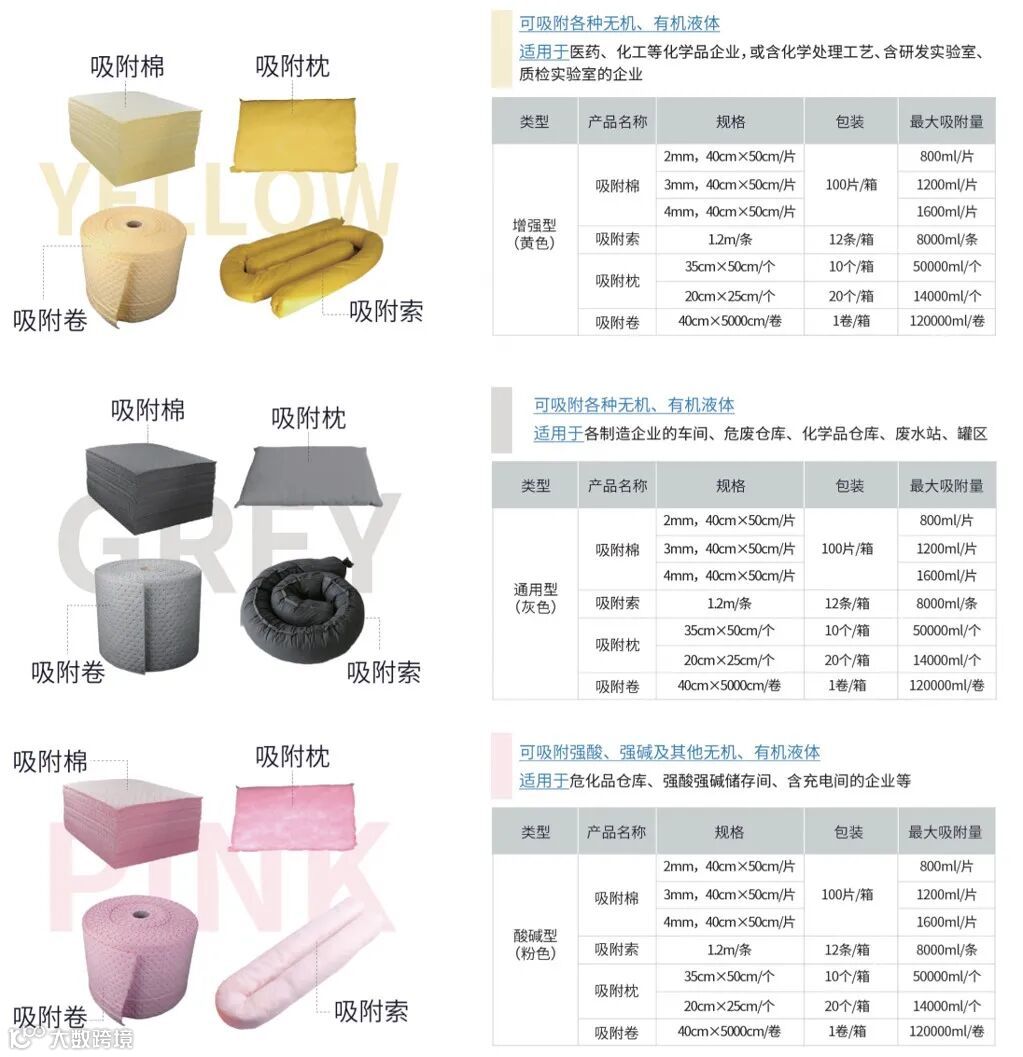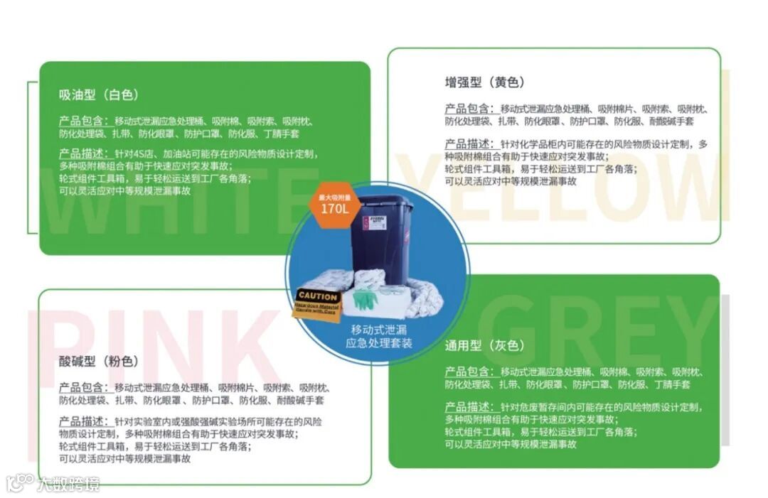 目前本店主打提供吸附类应急物资单品、防渗漏托盘、集污袋、以及化学品柜专用应急物资套装、汽修店专用应急物资套装等其他套装。