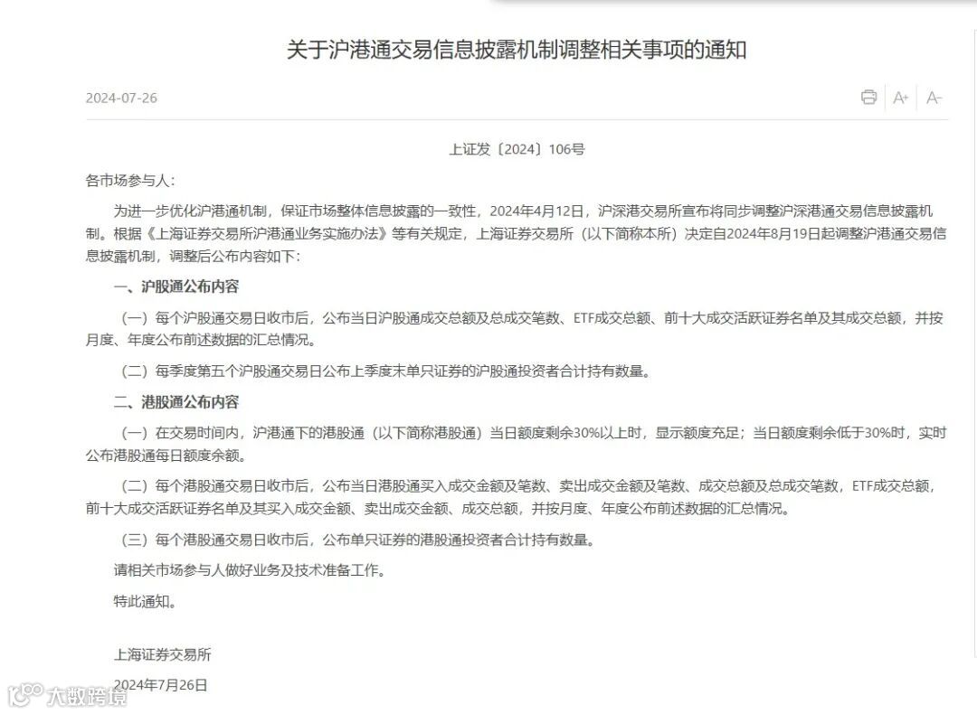 7月26日,上交所网站发布关于沪港通交易信息披露机制调整相关事项的通知。为进一步优化沪港通机制,保证市场整体信息披露的一致性,2024年4月12日,沪深港交易所宣布将同步调整沪深港通交易信息披露机制。根据《上海证券交易所沪港通业务实施办法》等有关规定,上海证券交易所决定自2024年8月19日起调整沪港通交易信息披露机制,调整后公布内容如下: