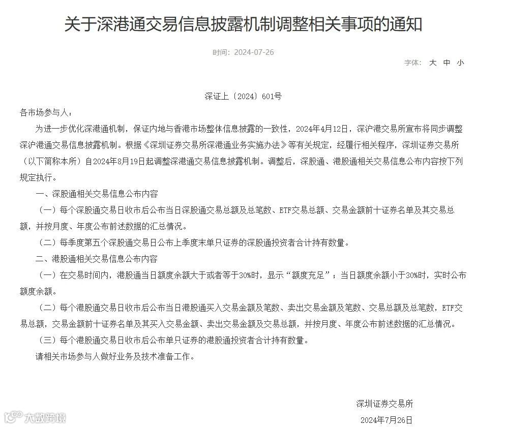 同日,深交所网站发布了关于深港通交易信息披露机制调整相关事项的通知。为进一步优化深港通机制,保证内地与香港市场整体信息披露的一致性,2024年4月12日,深沪港交易所宣布将同步调整深沪港通交易信息披露机制。根据《深圳证券交易所深港通业务实施办法》等有关规定,经履行相关程序,深圳证券交易所自2024年8月19日起调整深港通交易信息披露机制。调整后,深股通、港股通相关交易信息公布内容按下列规定执行。